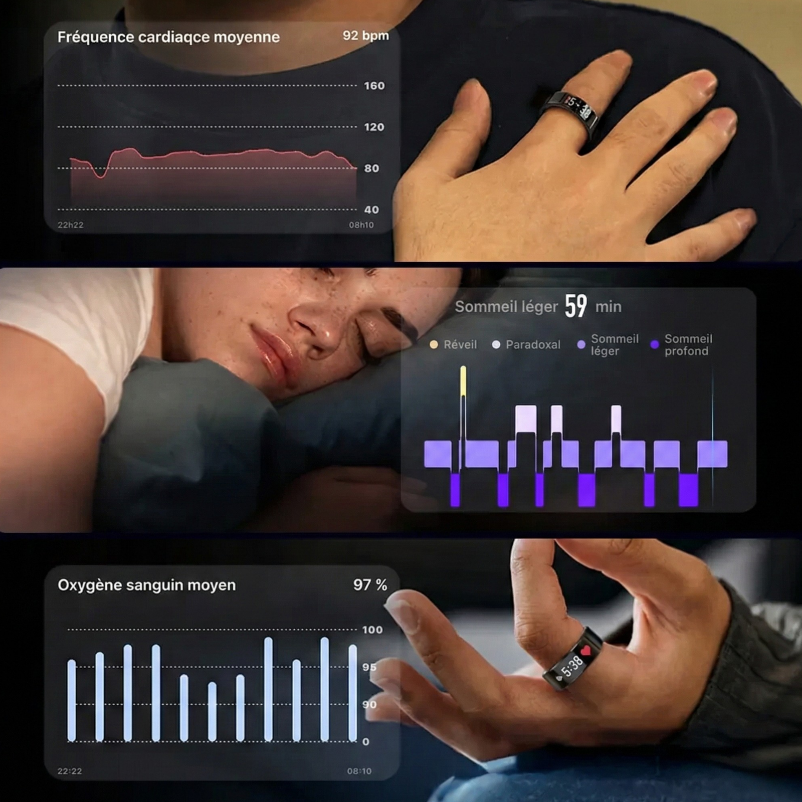 Ces tests permettent de nous assurer que la bague peut être portée dans les conditions de la vie quotidienne, tout en offrant des mesures fiables concernant l’activité, le sommeil et les indicateurs de santé.